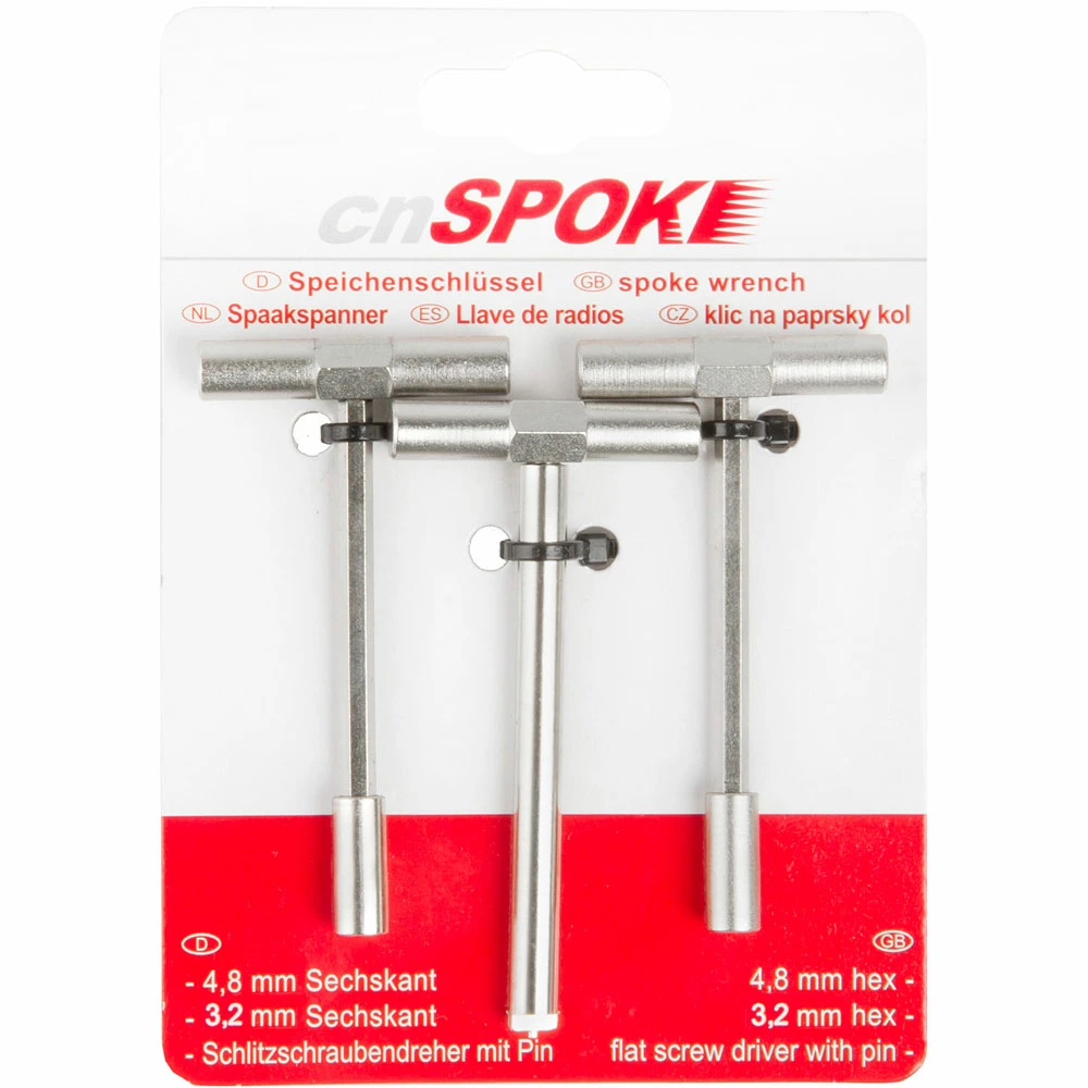 Le jeu de 3 clés à rayons de CN-Spoke – comprend un six pans de 3,2 mm, un six pans de 4,8 mm et un tournevis plat avec broche.