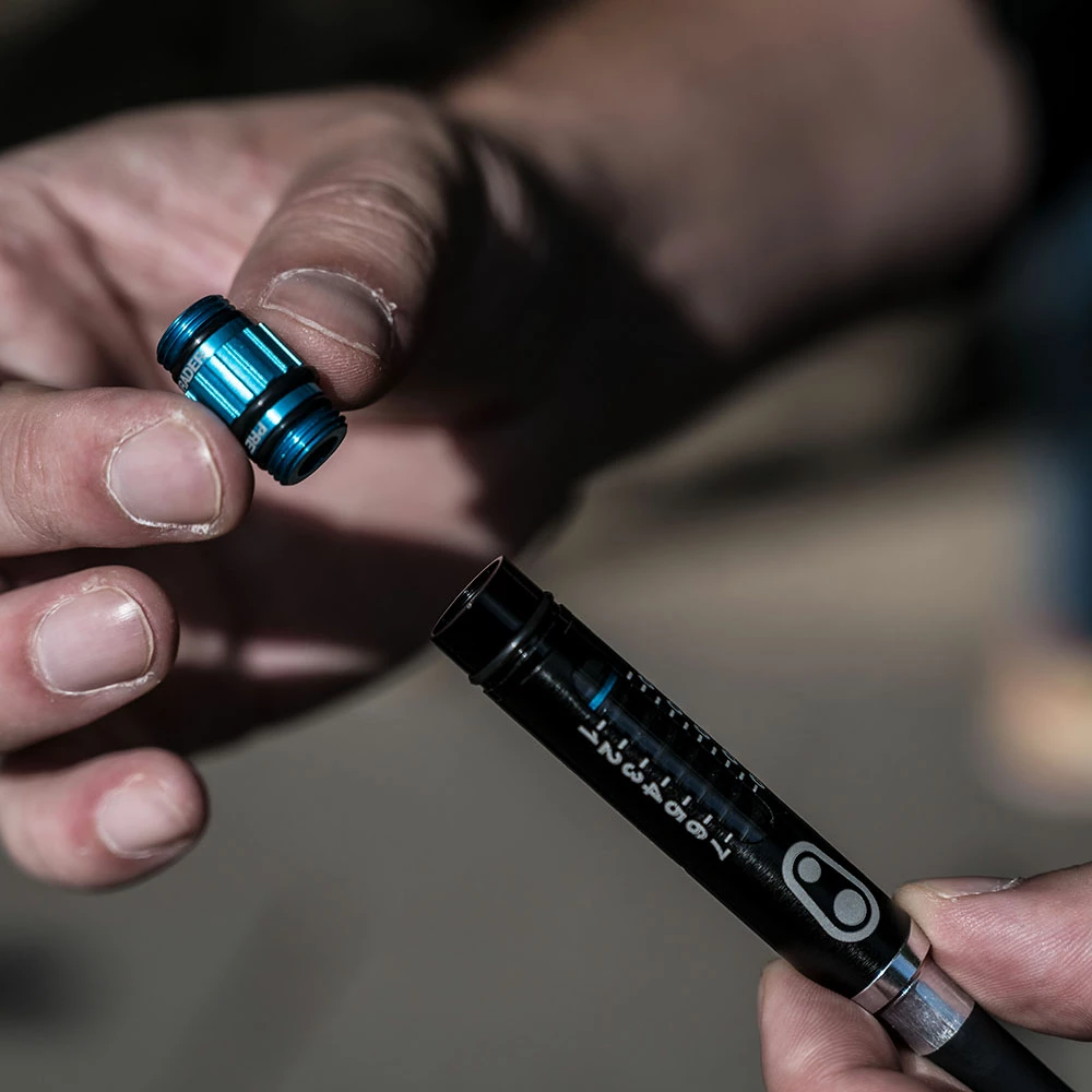 Si la pompe est nécessaire, le tuyau peut être facilement fixé à la pièce à main grâce à un verrou magnétique. La valve est compatible avec Presta et Schrader et est recommandée pour les pneus à partir de 1,8″ de largeur.